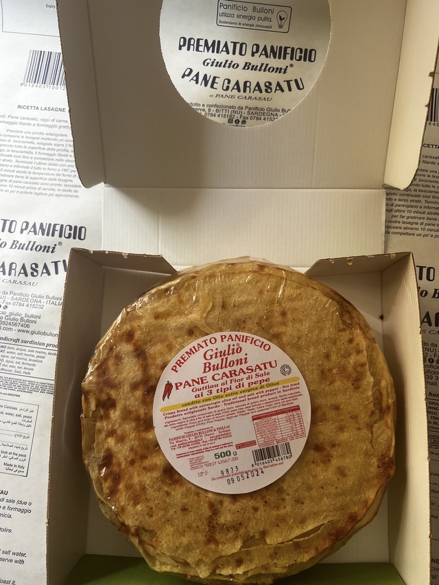 Pane Carasatu Guttiatu condito con olio EVO e fior di sale ai 3 tipi di pepe (rosa, sichuan, peperoncino sardo selezionato )